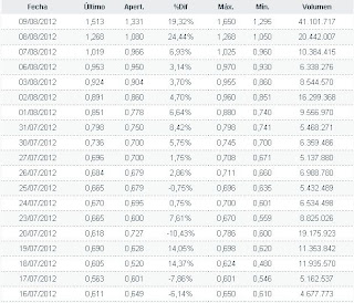 En primer lugar, respecto a la inminente llegada de las ayudas públicas a la banca, la misma ya se encuentra descontada por los mercados, desde el mismo momento en que se ha acordado un rescate por un valor de hasta 100.000 millones de euros, esto quiere decir, que el mercado ya cuenta con que ese dinero llegará y poco puede influir positivamente en la cotización, o no al menos, para subir de una manera tan disparatada desde mínimos (+200,0%).
